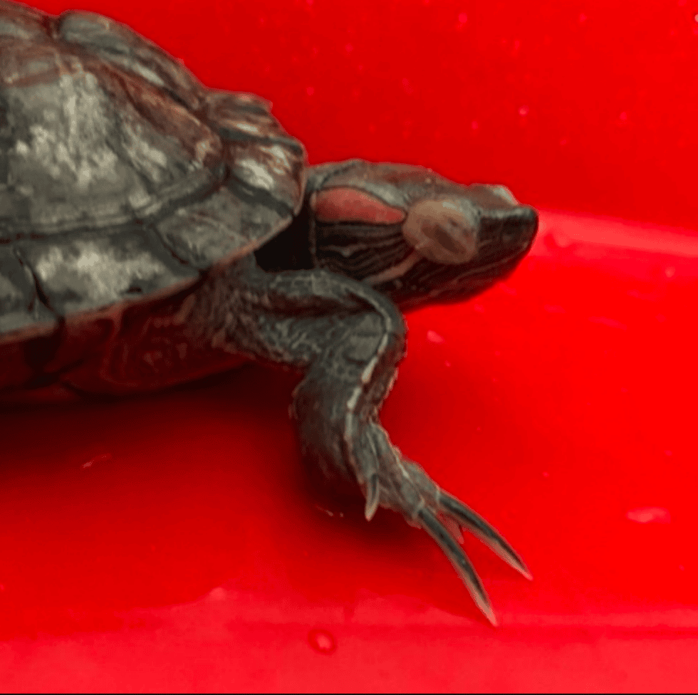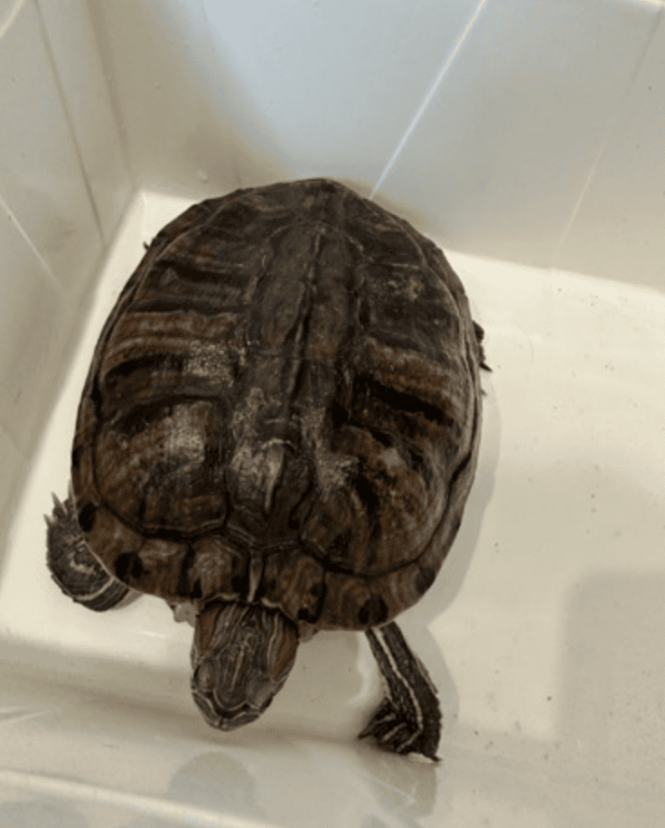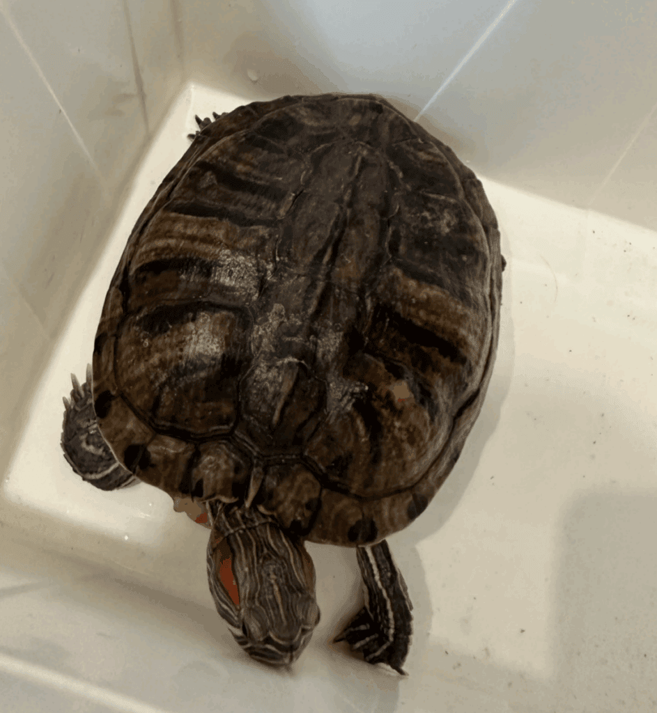 我在幫烏龜換水的時候,抓起烏龜但沒拿穩,我的巴西龜就從我手裡滑出去,背殼撞到陽台地板凸起的地方,大概從高度1公尺左右的地方摔到地上,烏龜背殼直接掉色,我用棉花棒擦拭隱約看到微微滲血,馬上預約看醫生,因為巴西龜的殼下面就是他們的肺,很怕會傷害到他的肺部!(從下圖可以看到烏龜的背殼左側偏上,有一小塊殼不見了)