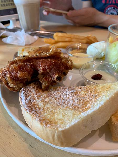 它的厚烤土司上面有糖粉,吐司剛考過熱熱脆脆的很好吃