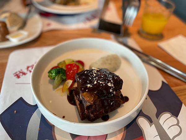 今天我們點了紅酒慢燉牛小排 以及西班牙臘腸搭台式香腸燉飯 2份主餐