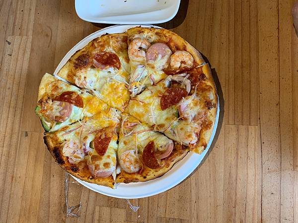 一上桌的海陸雙拼 8吋的披薩馬上被我們一掃而空