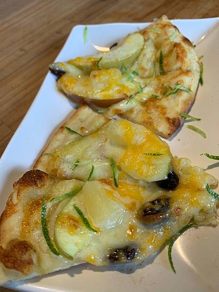 蘋果在窯烤披薩內被融合在其中,與起司相交的口感完全不衝突
